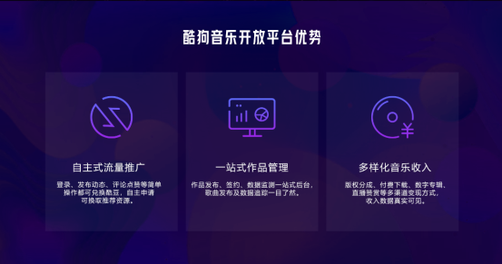 供自主式流量推广、一站式作品管理、多样化音乐收入等一站式平台服务。