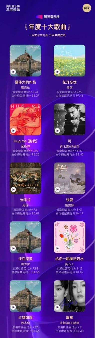 除此之外,腾讯音乐榜年度十大歌曲在一定程度上不仅代表着乐坛流行动向、时代审美表达,更因为兼顾热度和质量,已经是具有金曲潜力的年度佳作:周杰伦《最伟大的作品》天马行空的狂想再次掀起千万乐迷追逐的声浪,《还在流浪》让我们感叹心之所安即是故乡,《红颜如霜》再谈古筝,重现“周董式”唯美中国风;周深两首倾情力作——《光字片》《花开忘忧》治愈登榜;原飞儿乐队主唱詹雯婷《诀爱》中的声音响起,唤醒过往回忆;薛之谦与张靓颖合作的《可》唱出细腻的离别情愫。其他入选年度十大歌曲的还有蔡徐坤浪漫暖意满满的《Hug me》,告五人的迷幻摇滚神曲《给你一瓶魔法药水》,张韶涵、王赫野携手呈现的燃情热歌《篇章》,十首风格各异的音乐均从不同角度拓展着华语乐坛的新边界,也让我们看到这一年乐坛发生的大事件。