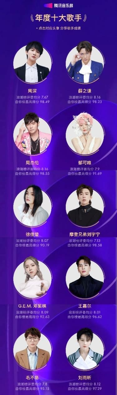 在腾讯音乐浪潮榜年度成绩中,周杰伦、G.E.M.邓紫棋等老将实力不减,大批年轻歌手也获得专业评委认可。周杰伦专辑同名歌曲《最伟大的作品》斩获最高得分歌曲;G.E.M.邓紫棋最新专辑《启示录》荣获上榜歌曲数最多的专辑;周深和郁可唯成为上榜歌曲最多的歌手;单依纯则是最年轻的上榜和冠军歌手。