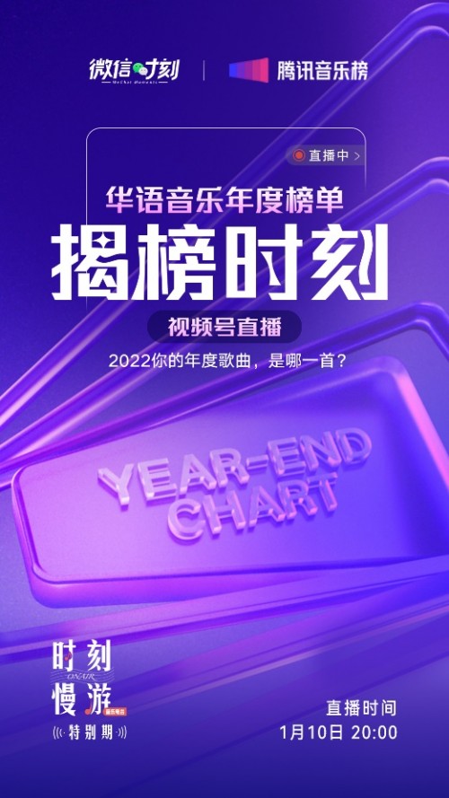此外,今天(1月10日)晚上八点,腾讯音乐榜将联合微信时刻,推出“2022腾讯音乐榜年度榜单揭晓时刻”视频号直播活动。不仅有丰富的互动游戏,还有艺人签名照和神秘大礼包。让我们在歌声的陪伴中,一同重温2022音乐记忆。