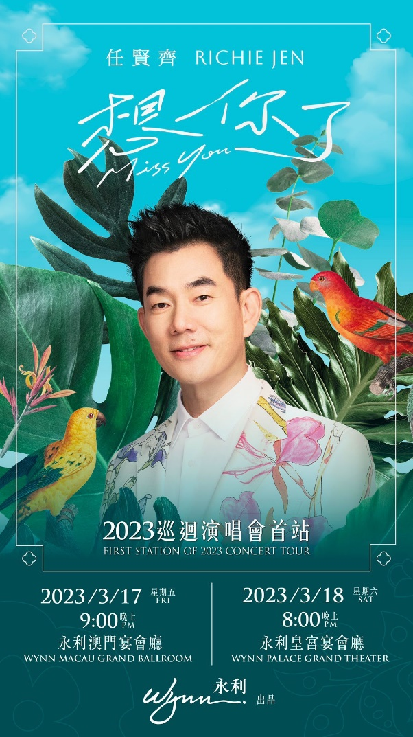 任贤齐“想你了”2023巡回演唱会首站门票由即日起公开发售,票价为澳门币380元起,可于永利官方售票网www.ticketing.wynnresortsmacau.com或亲临永利澳门永利大楼礼宾部及永利皇宫南接待处礼宾部售票处购买。