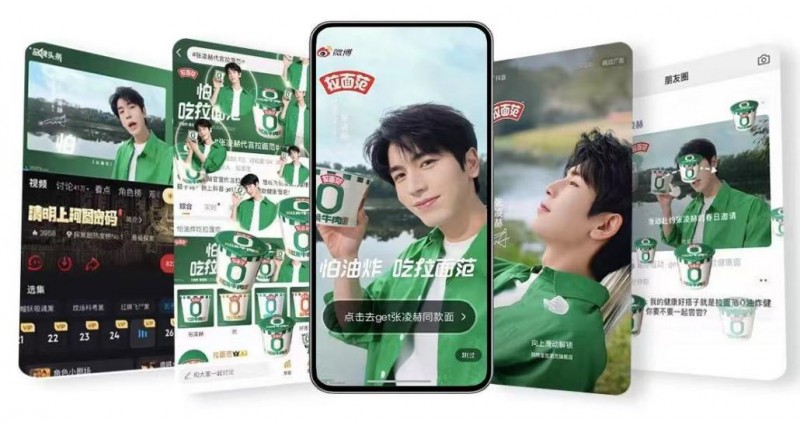 官宣日零点,拉面范以代言人本身的社媒声量作为切入点,在微博、抖音、朋友圈以及各大视频平台投放海量资源,通过互动落地与消费者建立沟通,让品牌形象更加立体。张凌赫×拉面范专属微博表情收获大批粉丝的喜爱与二创,并以其可爱形象成功破圈,引发泛娱乐粉丝受众的自发使用;在朋友圈,明星头像+首条评论的朋友圈广告展现形式,也吸引了年轻用户参与互动,将拉面范带入了更多泛受众视野。
