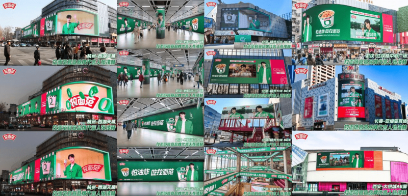线下地广更是排面拉满,官宣日当天,拉面范点亮北京朝外the box、杭州西湖天幕两处超规格地标3D裸眼大屏和武汉地铁洪山广场站环绕式大屏,在全国26城35块商超大屏投放代言人TVC。此般铺天盖地立体式宣传触达人次超2000万,以线上+线下超高可见度,提振品牌全渠道士气,助力品牌再攀高峰。