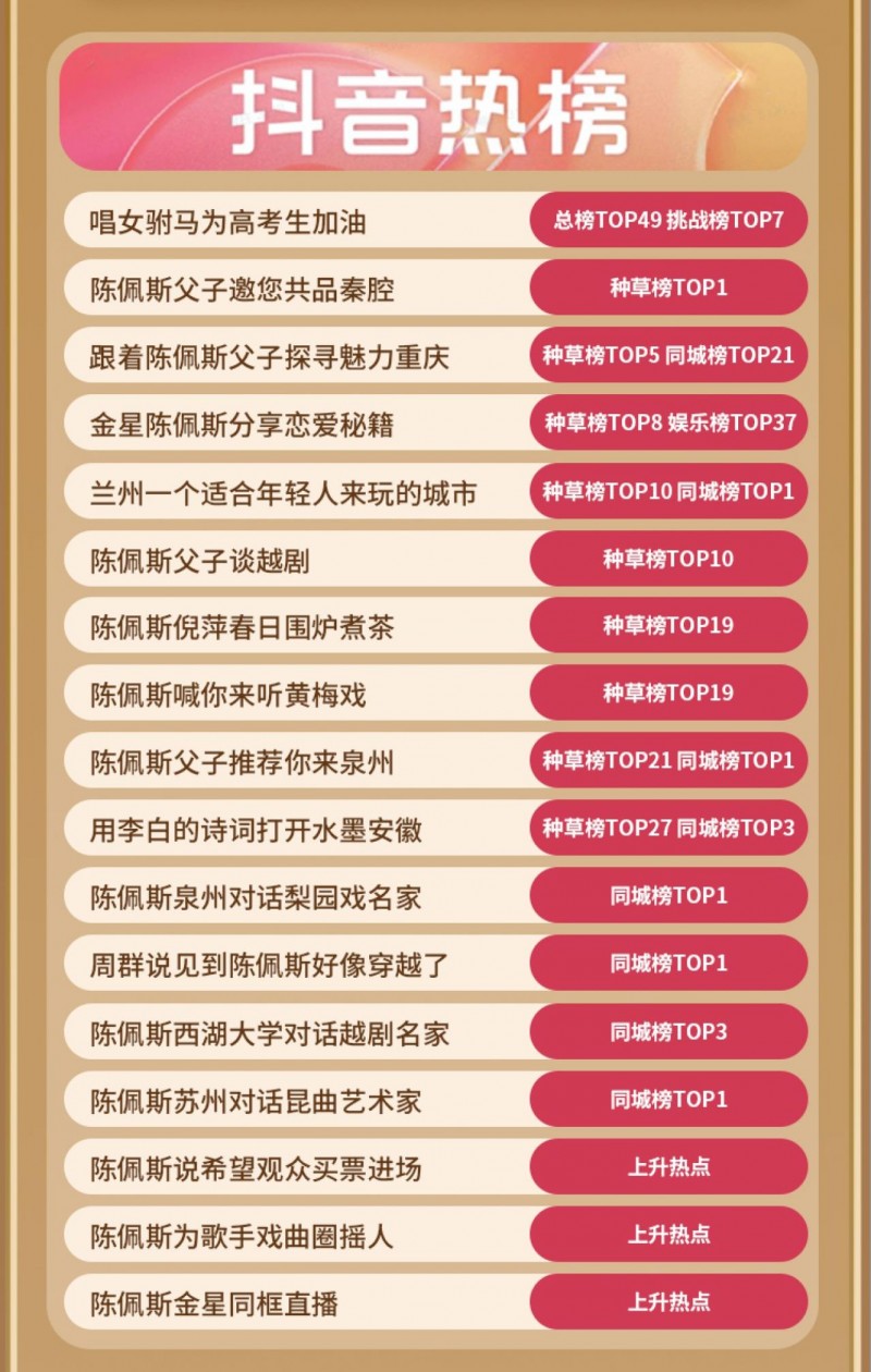 其中,在兰州站直播嘉宾的选择上,选择了当地秦腔表演艺术家苏凤丽与甘肃省电影家协会主席徐兆寿,在直播过程中,陈佩斯父子邀您共品秦腔的话题一度成为抖音种草榜第一名。而在重庆站的直播中,川剧表演艺术家沈铁梅与重庆饮食文化学者司马青杉的加入,不但让网友了解了川剧,跟着陈佩斯父子探寻魅力重庆的热点也让重庆的麻辣火热更加具体。